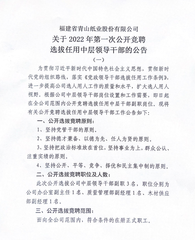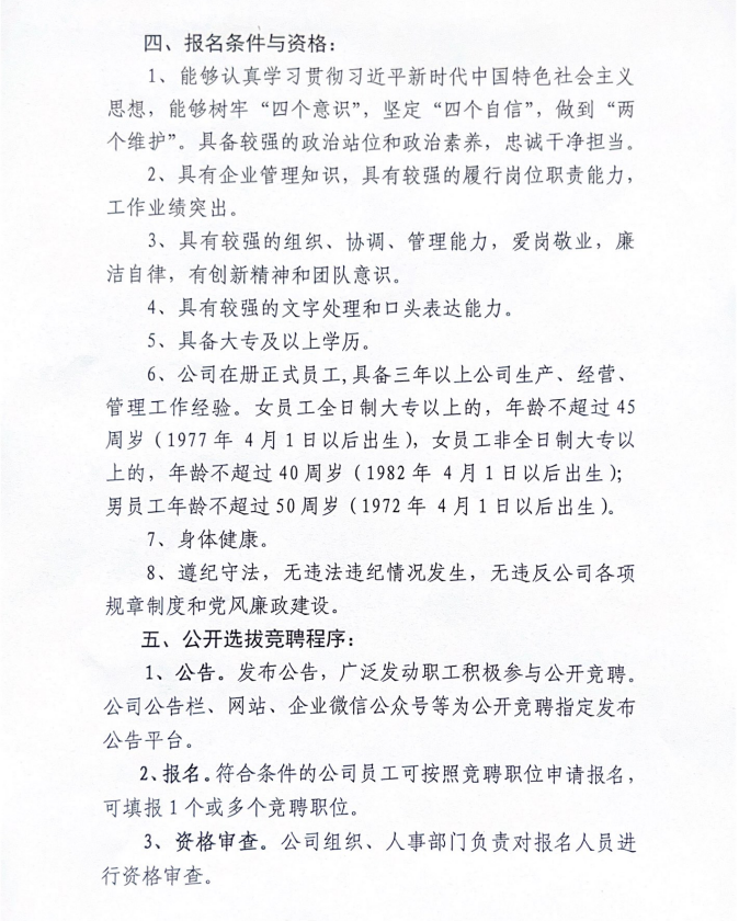 【概要描述】根据公司中层领导干部岗位设置和工作需要,即日起在全公司范围内公开竞聘选拔任用中层干部副职岗位。